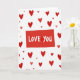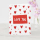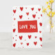 This card shows a white background with a red rectangle centered in the middle. Inside the rectangle, the words “LOVE YOU” appear in white, hand-drawn-style letters that look a little uneven in a sweet, human way. All around the rectangle, small hearts are scattered like confetti, with some larger and some smaller. The hearts are different shades of red, from deep red to softer pinkish red, which adds a gentle, romantic feel. The layout is simple, but it still feels full of care because the hearts look like they were placed with real feeling, not perfect precision 🥰. It’s a meaningful card to give when you want to say something direct and honest without making it complicated ❤️.