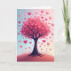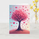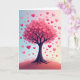 This design shows a dark, twisting tree with branches that hold heart-shaped leaves instead of regular ones. The hearts are in shades of pink, from light blush to deep fuchsia, and they make the tree look full of love 💘. The tree sits on a soft pink hill with a few thin blades of grass pointing upward. In the background, the sky fades from cool blue on the left to a warm golden tone on the right, giving the scene a calm, hopeful feel ❤️. Some of the hearts look like they are drifting away from the branches and floating up into the air, as if love is being shared. The hearts are different sizes and look slightly raised, like little cushions moving on a breeze. There is no text on the card, so the picture is the main message.