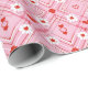 This full-frame, seamless wrapper design features a cheerful and romantic pattern perfect for Valentine's Day or festive celebrations. A pale pink background showcases repeating diamond-shaped frames created by intersecting diagonal lines in various shades of pink. Inside each diamond, two or three stylized red hearts and a white daisy-like flower with a dark red center are symmetrically arranged. The vibrant colors and playful elements make this wrapper a delightful choice for adding a touch of love and joy to any gift.