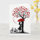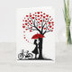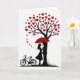 This design shows a black silhouette couple standing close together under a red umbrella, set against a white background. Above them is a tall black tree whose branches are filled with many small red hearts instead of leaves. A trail of tiny red hearts drifts down from the tree toward the couple, like a gentle shower of love ❤️. The woman’s long hair falls behind her as she tilts her face up toward her partner, and he holds the umbrella over them in a steady, caring pose. Off to the left, a black silhouette bicycle sits on a small patch of grass, suggesting they arrived together and chose to pause for this quiet moment. There isn’t any text on the front, so the picture carries the message through the colors and the closeness of the two figures. It feels meaningful to give because it’s about shelter, togetherness, and showing up for someone when it matters 🥰.