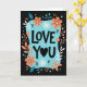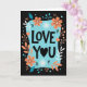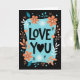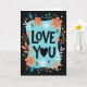 This greeting card features the words “LOVE YOU” in thick black letters, placed right in the middle. The text sits inside a soft aqua-blue shape with gently wavy edges, set against a deep black background. Around it, you’ll see coral-colored flowers, white leaves, and teal berries on thin stems that frame the message like a loose wreath. The “O” in “YOU” is replaced with a solid black heart, which makes the message feel even more direct and caring ❤️. A few small coral hearts and tiny teal dots are scattered nearby, adding a light, sweet touch without distracting from the main words. The contrast of aqua, coral, white, and black makes everything easy to see and gives the card a modern look. It feels meaningful to give because it says exactly what you want to say, with a little extra warmth in the details 🥰.