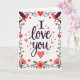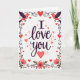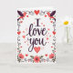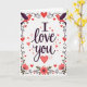 This card features the words “I love you” in deep plum lettering placed right in the center on a white background. The letters look like flowing calligraphy, with smooth curves that make the message feel tender and personal. Around the words, a dark brown swirling vine frames the middle, with tiny touches of gold tucked along the curls. In the top corners, two small birds perch and face inward, colored coral pink with dark purple wings, as if they’re quietly sharing the message together. In the bottom corners, two flowers in coral and rosy shades bloom beside green leaves, adding a gentle, nature-inspired setting. Little hearts in reds and soft pinks float around the design, making the whole scene feel affectionate without being too much 🥰. It’s a meaningful card to give because it pairs a simple message with caring details that suggest closeness and warmth ❤️.