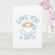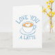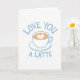 This Valentine's Day card shows a white coffee cup sitting on a matching saucer against a plain white background. Inside the cup is creamy beige latte foam with a neat heart shape in the center, which makes the whole scene feel sweet and caring 🥰. Above the cup, the words “LOVE YOU A LATTE” curve in a soft sky-blue color. The letters look like casual hand lettering, and the curved placement frames the cup like a gentle hug. The cup and saucer are outlined in the same light blue, with slightly uneven lines that make the drawing feel warm and human. It’s a simple design, but it clearly connects a cozy everyday drink with saying “I care about you.” This is a thoughtful choice for a partner, friend, or anyone you share coffee moments with ❤️.
