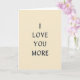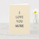 This greeting card keeps things simple with the words “I LOVE YOU MORE” as the whole focus. The message is set in a classic serif letter style, in a dark charcoal color that stands out clearly. The words are stacked in three lines and centered on the front, so your eyes go straight to the message. Behind the text is a soft, creamy beige background that feels warm and calm. With no extra pictures or objects, it reads like a quiet note you’d leave for someone you care about ❤️. It feels meaningful because it says a lot without needing to explain, and it works for romance or a close friendship 🥰. Share it to pass along sweet Valentine’s Day feelings in a simple, honest way.