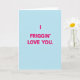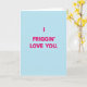 This card shows a sky-blue background with one big message in the middle: “I FRIGGIN’ LOVE YOU.” The letters are hot pink and look like a simple, all-caps sans-serif style, making the words easy to read at a glance. With no characters or extra objects, the focus stays on the message and the feeling behind it. The bright blue and pink together feel upbeat and a little daring, like you’re saying it out loud without holding back. Using “friggin’” makes it sound casual and real, like something you’d say to a partner or close friend when you really mean it. It’s meaningful because it keeps things honest and direct, which can feel extra comforting on Valentine’s Day. ❤️🥰