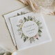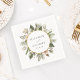 These these romantic botanical wedding napkins feature a watercolor ivory floral and greenery design arranged around a gold circle on an ivory background. Add the couple's names in charcoal gray serif font, with the wedding date below in sans serif.
