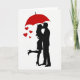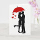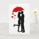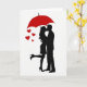 Designed with a simple black-and-white scene, this card shows a couple in dark silhouettes leaning in for a kiss. Their faces touch gently, and the woman lifts one leg slightly behind her, giving the moment a sweet, caught-in-the-rain feeling. Above them is a bright red umbrella, the main splash of color, as if it’s keeping their little world safe and close. Off to the left, four small red hearts float nearby, adding an extra hint of love without taking over the scene ❤️. The background is plain white, so your eyes go straight to the couple, the umbrella, and the hearts. There isn’t any printed message on the front, which leaves space for you to write what you really mean inside 🥰. It feels meaningful because it says “I’m here with you” in a quiet, direct way, and it’s easy to give to a partner or someone you care about.