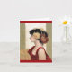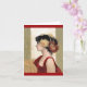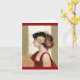 This vintage image has an elegant, romantic woman in a red dress. She has large red and yellow flowers in her dark hair. She is holding a bouquet of flowers. The background is white and tan with a deep red border. See my store Art by MAR for matching products with this design.