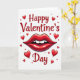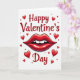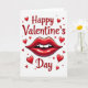 This Valentine's Day card features a white background with rich red details that stand out right away. Across the upper center, it reads “Happy Valentine’s Day” in smooth, flowing red lettering that feels friendly and warm. Just below the words, a pair of deep ruby-red lips sits in the middle, slightly parted with a small glimpse of white teeth. Around the lips and text, shiny red hearts of different sizes are scattered across the front, with small light highlights that make them look glossy. The simple layout keeps your attention on the message and the kiss, which makes the card feel romantic without trying too hard. It’s a sweet choice for a partner or someone you care about, because it suggests affection in a clear, easy way ❤️. Share it to help say what you feel on Valentine’s Day 🥰.