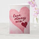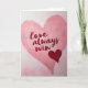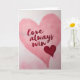 This greeting card shows a large pink heart in the center with a soft, slightly textured look, like gentle paper. Inside the heart, the words “love always wins” are written across the middle in flowing red lettering that looks smooth and hand-drawn. The background is a light pink wash with faint, blurry heart shapes that sit behind the main heart and make the scene feel calm and sweet. Near the lower right edge of the big heart, there’s a smaller dark red heart that stands out with its deeper color. The big heart feels warm and welcoming, while the smaller heart adds a strong little accent that draws your eye. Overall, the design keeps things simple and romantic, with a cozy glow that fits the holiday mood. It’s an easy card to give to a partner, close friend, or anyone you care about 💕❤️.