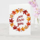 This card shows a white background with a round wreath of autumn leaves wrapped around the center. The leaves look like maple leaves in shades of russet red, orange, golden yellow, and soft caramel, with a bit of overlap that gives the wreath some depth. Tucked between the leaves are small, round cranberry-red berries that add little pops of color. In the middle, the words “we love you” appear in deep cranberry red, written in a flowing cursive style. The text sits centered inside the wreath and stands out clearly against the white space. The overall look feels cozy and caring, like a warm note you can give to someone you really appreciate 🥰. It’s a thoughtful way to show love to a partner, friend, or family member, and to share Valentine’s Day feelings with them ❤️.