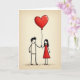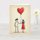 This card shows two simple, stick-figure-style people standing side by side on a light cream background that looks a bit like textured paper. The person on the left has short black hair with a little messy tuft, and the person on the right wears a red dress that matches the big heart above them. They’re holding hands, and a thin string rises from between them to a shiny red heart balloon floating overhead. Both faces have small, gentle smiles that make the scene feel calm and close 🥰. A faint gray line under their feet suggests the ground, keeping the moment grounded and real. There isn’t any text on the front, so the picture carries the message on its own in a quiet, easy way. It feels meaningful to give because it focuses on togetherness and a shared love that feels steady and sweet ❤️.
