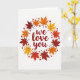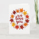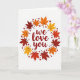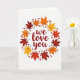 On the front of the card the words “we love you” sit in the center in a flowing, handwritten-style red lettering. A round wreath of autumn leaves circles the message, with maple leaves in deep reddish-brown, orange, and golden yellow. The leaves show gentle vein lines and are spaced evenly so the ring feels calm and balanced. Small red hearts and tiny berry-like dots are sprinkled around the wreath for extra warmth ❤️. The background is plain white, which makes the reds and fall colors stand out clearly. It feels meaningful to give because the message is simple and direct, like something you’d say out loud to someone you care about 🥰. It works well for romance, close friendship, or family, especially when you want to remind someone they’re loved. Hope it helps you share Valentine’s Day feelings in a kind, easy way.
