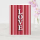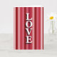 This greeting card features the word “LOVE” in large white capital letters stacked vertically right in the center. The letters use a classic serif style, and each one has a deep red shadow that gives it a slight 3D look. Behind the text, the background is filled with vertical stripes in shades of red and pink. Some stripes are thin and others are wider, which adds a nice sense of movement without feeling busy. The overall color mix feels warm and romantic, like a simple love note made visual. The only text is “LOVE,” and it stands out clearly against the striped background. It’s a sweet, direct design that’s perfect for sharing with someone special 💕❤️.