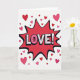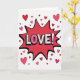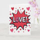 This card radiates joy and excitement with a bold design that instantly draws attention. At the center, the word “LOVE!” stands proudly, filled with bright white letters. The “L,” “V,” and “E” are outlined with dashed pink lines, while the “O” appears in soft pink decorated with white polka dots, adding contrast and charm. The word sits inside a vivid red burst outlined in black, creating a strong sense of depth. The white background is sprinkled with hearts in different shades of red and pink, floating at various sizes to add movement and warmth. A tiny heart forms the dot of the exclamation mark, finishing the card with a sweet romantic touch.