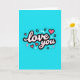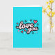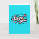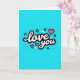 This card shows a bright turquoise background with the words “Love you” right in the center. The lettering is rounded and thick, in bubblegum pink with a thin white outline and a black outline around that, so it looks like a sticker sitting on top of the page. Around the message are several pink hearts, some filled in and some just outlined, floating like confetti. You’ll also notice little white star shapes and dots, plus thin black curly lines that swirl between the hearts. Behind the main words there’s a lighter cyan cloud-like shape that helps the design stand out without crowding it. The whole look feels happy and affectionate, like a quick reminder that you care 🥰. It’s a meaningful card to give because the message is simple, direct, and easy to feel, and it’s perfect for sharing Valentine’s Day sentiments ❤️.