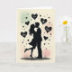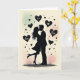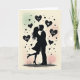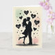 Designed with a simple silhouette look, this card shows a couple kissing in the center, drawn in solid black against a soft beige background. The woman leans into the man with her hair flowing back, one leg lifted behind her in a high heel, which makes the moment feel sweet and full of motion. The man holds her close with a steady, protective stance, keeping the focus on their closeness. Around them, small black hearts float upward in different sizes, like they’re rising into the air. Some of the hearts include the word “love” in a flowing, cursive-style black lettering, placed inside the hearts near the top of the card. Gentle washes of pale green and pink sit behind the couple, and a thin hint of grass at the bottom grounds the scene. It feels meaningful to give because it captures that quiet, can’t-help-it kind of affection 🥰❤️.