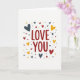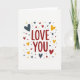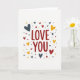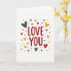 This card centers on the words “LOVE YOU” in deep red letters, set right in the middle so your eyes land there first. The lettering looks like a friendly, simple print style, easy to read and direct. Around the message, a scatter of hearts floats like confetti, with some hearts larger and some smaller. The hearts are colored in muted blue-gray and warm yellow, which balances the strong red text nicely. Everything sits on a plain white background, so the message and shapes feel open and uncluttered. There’s a light, slightly grainy texture in the solid colors that keeps the design from feeling flat. It’s a meaningful card to give because it says exactly what you feel, with a sweet, upbeat look that fits romance or close friendship 🥰❤️. Hope it helps you share Valentine’s Day feelings with someone special.
