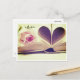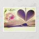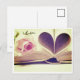 A postcard that celebrates romantic love with a rose rose and the pages of a book in heart with poetry or a love story. On the back is a quote by Oscar Wilde translated into German.