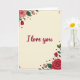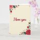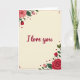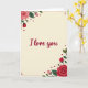 This Valentine's Day card features the words “I love you” in flowing red lettering right in the center on a soft, creamy yellow background. In the top-left corner, there’s a full pink rose with a small red bud and green leaves, all angled inward toward the message. The bottom-right corner mirrors that look with a deep red rose, a small pink bud, and more leaves. Tiny red hearts are scattered around the flowers and across the open space, adding a sweet, romantic touch 💕. A thin, lightly drawn border frames the card, with small corner details that keep the layout tidy without taking attention from the center. The overall feel is calm and loving, with gentle colors and a clear focus on the message ❤️.