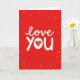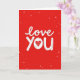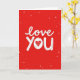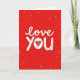 This design shows a bright red background with scattered white dots that look like falling snow or confetti. In the center, the words “love you” stand out in white, written in a loose brush-letter style with slightly uneven edges that feel human and sincere. The text sits front and center, filling most of the card so your message is the first thing someone sees. The “o” in “you” is replaced by a white heart, and inside the heart are small chevron lines that add a little detail without distracting. The overall look is simple but strong, and it instantly reads as caring and romantic ❤️. It feels meaningful to give because it says what you might struggle to say out loud, in a direct and tender way 🥰. It’s an easy way to share Valentine’s Day feelings with someone you care about.