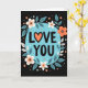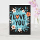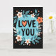 This design shows the words “LOVE YOU” in simple black sans-serif letters, centered on the card. The “O” in “LOVE” is replaced with a coral-orange heart, which makes the message feel extra caring ❤️. The text sits inside a soft, slightly uneven sky-blue oval that stands out against a deep black background. Around the oval is a floral wreath made of muted teal leaves with black veins, mixed with off-white leaves for contrast. You’ll also see five-petal flowers in two main looks: white petals with coral centers, and coral petals with speckled white centers. Small matching blossoms and scattered dots in light blue, coral, and white fill in the space like little sprinkles of joy. It feels meaningful to give because it’s direct and warm, with a sweet heart detail that says what you might not say out loud 🥰.