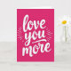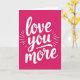 This greeting card features the phrase “love you more” in white, flowing cursive letters stacked down the center. The background is a strong fuchsia pink that makes the message stand out right away. The words look smooth and rounded, and there’s a soft shadow behind them that adds a little depth. Short white lines radiate out near the text like gentle bursts, drawing your eye to the message. Everything is simple and focused, so it feels direct and sincere without needing extra details. It’s a sweet way to tell a partner, close friend, or family member that your care keeps growing 🥰. The centered layout makes it easy to read and feels like a clear, honest note from the heart ❤️.