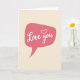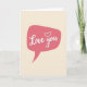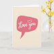 This design shows a rose-pink speech bubble centered on a creamy beige background, with rounded edges and a small pointed tail like someone is speaking softly. Inside the bubble, the words “Love you” appear in white, flowing cursive-style lettering, placed right in the middle. A small outlined heart sits just above the word “you,” like a gentle accent to the message ❤️. The pink feels soft and calm against the light background, keeping the focus on the simple words. A faint shadow under the white letters gives them a slight lift without making the card feel busy. It’s the kind of card that works for a partner, close friend, or anyone you care about, because it says a lot without trying too hard 🥰. Giving it feels meaningful since the message is clear, direct, and easy to believe. Hope it helps you share Valentine’s Day in a warm, honest way.
