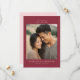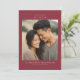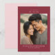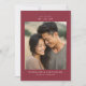 This wedding save the date card features a warm, intimate photograph of two individuals in an affectionate pose, framed by a solid maroon border. The design employs a minimalist layout with clean, sans-serif typography that highlights customizable elements for names and dates. The color palette includes earthy tones from the photo, complemented by the rich maroon border, creating a cozy and elegant aesthetic. Perfect for conveying love and anticipation, this card is ideal for couples looking to set a romantic tone for their upcoming celebration.