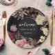 Romantic vintage look moody floral wedding paper plate features a beautiful flower and greenery pattern on a dramatic black background, and includes welcome script with names and date.