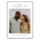 This wedding table card features a serene and intimate photograph of two individuals standing close together, framed by ample white space for a clean, minimalistic look. The color palette includes muted tones with a light blue-gray shirt and a yellow floral dress set against a soft-focus outdoor background. Elegant cursive script fonts add a romantic touch, making it perfect for personalizing your event seating arrangements. The design captures genuine emotions in a realistic style, evoking warmth and love, ideal for weddings or formal gatherings.