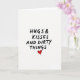 This card immediately catches the eye with a simple but direct message written in bold black handwriting on a clean white background. The words "HUGS & KISSES AND DIRTY THINGS" take center stage, looking like they were scribbled with a thick marker in a fun, carefree way. Below this phrase, a bright red heart adds a pop of color, standing out in a sea of black and white. The overall feeling of the card is sweet and intimate, mixing affection with a hint of playfulness. The design keeps things minimal, letting the words speak for themselves and balancing a loving tone with a bit of cheeky charm. The hand-drawn look of the letters gives the message a genuine and daring feel, creating a story of sincere and bold expression. This card is perfect for sharing some love and laughter on Valentine's Day ❤️💌🍫.