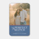 This wedding match design features a romantic layout with a stunning photograph of a couple in a sunlit field, creating a dreamy and warm atmosphere. The lower section showcases a solid navy blue background with elegant white typography that reads "The Perfect Match," followed by customizable names in a classic serif font. The color palette transitions from golden tones to deep blue, enhancing the sophisticated and timeless style. Ideal for weddings, this design captures love and celebration with its minimalist motifs and refined aesthetic.