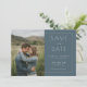 This wedding save the date features a split layout with a heartfelt photograph of a couple embracing in a field on one side, and a clean navy blue panel with modern typography on the other. The design combines natural elements with contemporary style, using a muted color palette that transitions smoothly from greens to blues. The bold, sans-serif font highlights essential details while maintaining an elegant and minimalist aesthetic. Perfect for setting the tone for a memorable event, this design exudes warmth and anticipation, inviting guests to mark their calendars for a special celebration.