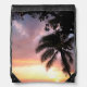 On this enchanting drawstring back pack is a magical palette of lavender oranges, and yellow pastels strewn across a tropical evening sunset with a black silhouetted palm tree in the distance for dramatic effect. Perfect for any tropical themed accessory and decor.