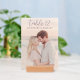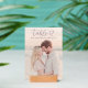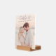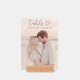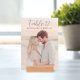 This wedding table card features a romantic beach scene with two individuals standing close together, set against a blurred ocean backdrop during sunset or sunrise. The design uses soft pastel colors like light beige, pale pink, and muted blues to create a dreamy, ethereal effect. Elegant cursive typography highlights "table 12," while simple sans-serif text adds clarity for the names. The overall mood is warm and intimate, perfect for celebrating love and tranquility at your special event.