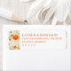 This return address label features a romantic and vintage-inspired design with a soft pastel floral pattern on the left, showcasing hues of orange, yellow, green, and beige in a watercolor style. The right side presents elegant, coral red serif typography that is customizable for names, addresses, locations, and dates, offering a personal touch to your correspondence. The balanced composition combines delicate florals with clean text, creating an atmosphere of warmth and nostalgia, perfect for adding charm to wedding invitations or special occasion mailings.