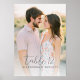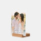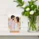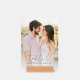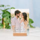 This wedding table card features a warm, romantic photograph of two individuals sharing an affectionate moment in a natural outdoor setting. The design uses soft pastel colors and includes elegant cursive typography for "table 12" along with simple sans-serif text for personalization. The floral pattern on the dress adds a delicate touch to the overall aesthetic, creating a joyful and intimate atmosphere perfect for celebrating love at your special event.