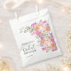 Romantic pastel wild flowers spring summer bridal favor bag with pretty wild country flowers in pink, peach, purple, lavender, green leaves and more, with a brushed script typography on an elegant editable soft pastel pink background.