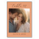 This wedding table card features a warm, peach-colored background with a soft-focus photograph of two individuals in an intimate pose. The design includes elegant cursive script for "table 12" and a simple serif font for the names at the bottom, creating a romantic and inviting atmosphere. The color palette consists of creamy tones and subtle golds, enhancing the dreamy sunset ambiance. Perfect for adding a personal touch to your wedding reception, this card combines modern typography with a classic style, making it ideal for formal gatherings that celebrate love and togetherness.