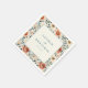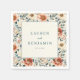 These wedding napkins feature a romantic floral design with large, soft peach and pink blooms surrounded by muted green leaves, creating an elegant vintage aesthetic. The central white rectangle offers customizable space for names and dates in classic serif typography, enhancing the formal yet intimate feel. Perfect for adding a touch of natural beauty to your special day, these napkins convey warmth and celebration, making them ideal for weddings or other significant occasions.