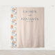 This elegant wedding backdrop features a soft peach background with a vertical floral border of large roses in shades of peach and cream, creating a romantic frame. The design includes customizable text in a clean serif font, with the word "and" styled in cursive for added elegance. The overall style is classic and sophisticated, perfect for formal occasions, with a warm and inviting mood enhanced by the harmonious color palette and gentle floral accents.
