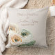This romantic floral throw pillow features an elegant ivory color background with watercolor ranunculus flowers. A delicate bouquet of peach and white colored ranunculus is pictured on the bottom. The names of a sample newlywed couple and wedding date are printed above. You can personalize the pillow to include your own custom names or text.