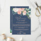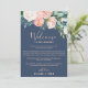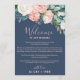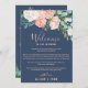 These romantic peonies blue welcome letter & itinerary cards are perfect for an elegant wedding. The floral design features blush pink, peach and white cascading watercolor flowers on a navy blue background. The front of the card features a welcome letter and the back of the card features the wedding itinerary. These notes are perfect for destination weddings and hotel guest welcome bags.