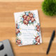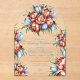 A beautifully illustrated bouquet of flowers. The bouquet consists of large, vibrant peonies in shades of terracotta and blue, complemented by smaller blue tulips. There are also green leaves and golden accents, possibly representing stems or other floral elements. The flowers are centrally positioned, with a pair of intertwined golden rings placed amidst them. The entire composition is set against a white background, emphasizing the colors and details of the flowers.