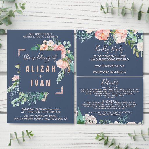 These romantic peony flowers blue wedding program fans are perfect for an elegant wedding. The floral design features blush pink, peach and white watercolor flowers with faux rose gold geometric elements on a navy blue background. Include the name of the bride and groom, the wedding date and location, thank you message, order of service, and bridal party. Order your programs assembled or non-assembled.