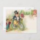Adorable vintage illustration of a pig in top hat riding a bike and carrying a bouquet of flowers to his girlfriend who is looking over a wall and holding a pretty fan