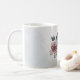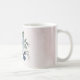Beautiful botanical coffee mug featuring pink, dusty blue and navy blue flowers with green leaves.