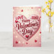 On the front of the card is a large heart in the center, shaded a soft blush pink with a gentle fabric-like texture. Across the heart, deep red words read “LOVE” and “XOXO,” with “Happy Valentine’s Day” and “be Mine” placed nearby, all with a shiny, candy-like look. The lettering mixes thick, raised-looking letters with smoother flowing letters, so the messages stand out clearly. Small glossy red hearts are scattered on the big heart and also drift in the background, adding extra little touches of affection ❤️. Behind everything is a hazy glow with pale pink and creamy tones, plus soft light circles that make the scene feel dreamy and calm. Fine gold swirls and tiny starburst shapes sit around the design like light sparkles, giving it a special finish without taking over. It feels meaningful to give because the words are simple and direct, and the warm colors make the message feel close and sincere 🥰.