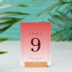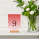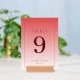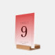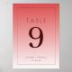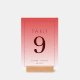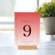 This wedding table card features a minimalist design with a soft gradient background transitioning from light pink to coral, creating a warm and inviting atmosphere. The layout is clean and modern, centered around a bold numeral "9" in dark brown, complemented by simple sans-serif typography for the word "TABLE" above and customizable names below. The overall aesthetic exudes sophistication and elegance, making it perfect for formal occasions like weddings. Its understated charm and cohesive color palette ensure it adds a touch of romance and clarity to any event setting.